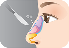 돌출된 뼈와 연골을 잘라준 후 콧등의 폭이 넓어지는 것을 방지하기 위해 외측절골술을 하여 코뼈를 가운데로 모아줌